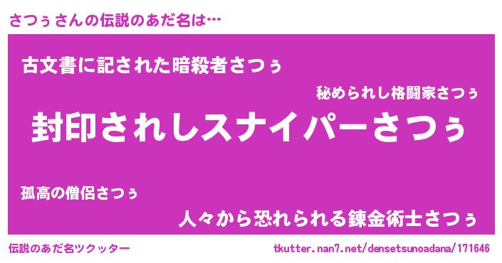 | 男性向けラノベタイトル風あだ名 | 『サツゥアートオンライン』 |