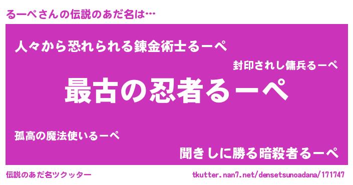 | 意味不明あだ名 | 『もやし科るーぺ属』『永久保存るーぺ』 |