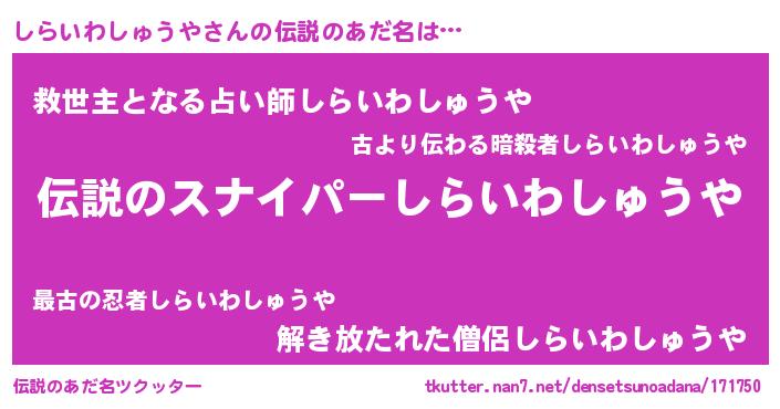 | 男性向けラノベタイトル風あだ名 | 『しらいわしゅうやの憂鬱』 |
