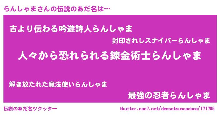 | 男性向けラノベタイトル風あだ名 | 『おまえをオタクにしてやるから、俺をらんしゃまにしてくれ! 』 |