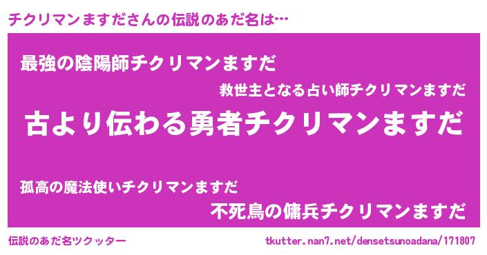 | 男性向けラノベタイトル風あだ名 | 『この素晴らしい世界にチクリマンますだを!』 |