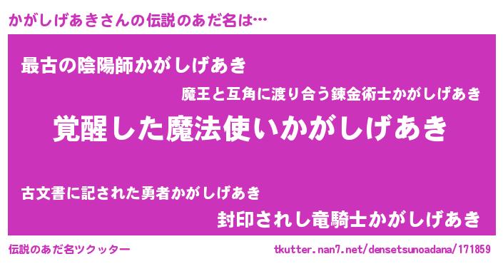 | 男性向けラノベタイトル風あだ名 | 『かがしげあき~年齢イコール彼女いない歴の魔法使い~』 |
