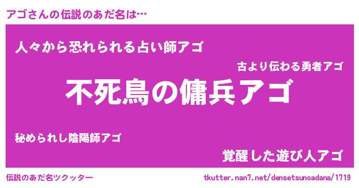 | 男性向けラノベタイトル風あだ名 | 『アゴに滅ぼされるだけの簡単なお仕事です』 |
