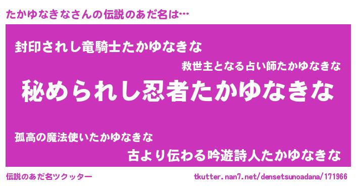 | ヒーロー風カッコイイあだ名 | 『仮面タカダー』『スーパータカユナキナ』 |