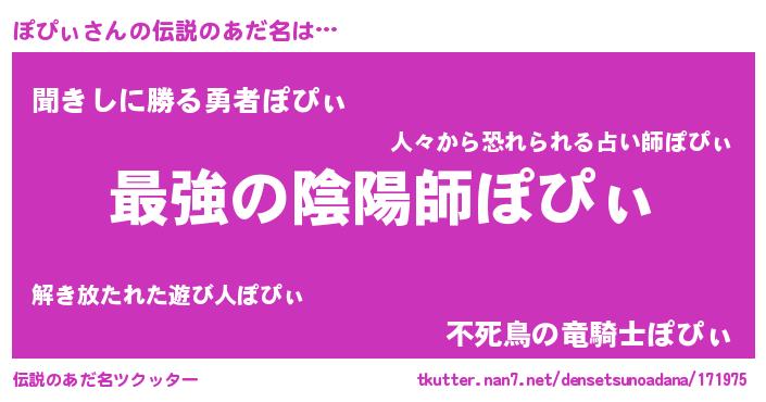 | 男性向けラノベタイトル風あだ名 | 『Re:ぽぴぃから始める異世界生活』 |