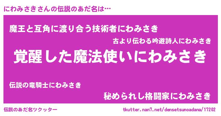 | 意味不明あだ名 | 『自称にわみさき』『永久保存にわみさき』 |