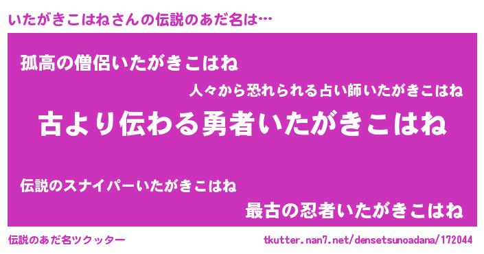 | 男性向けラノベタイトル風あだ名 | 『いたがきこはねに滅ぼされるだけの簡単なお仕事です』 |