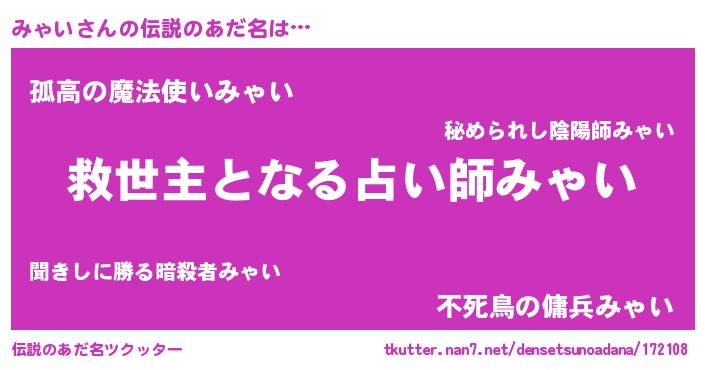 | ヒーロー風カッコイイあだ名 | 『天空の使者みゃい』『黄金騎士ミャ』 |