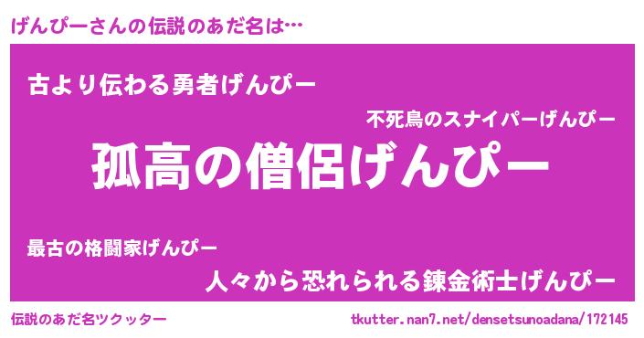 | 男性向けラノベタイトル風あだ名 | 『ダンジョンにげんぴーを求めるのは間違っているだろうか』 |