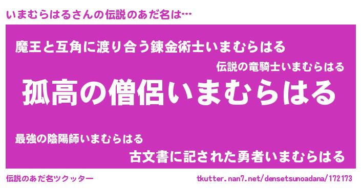 | ポケモン風あだ名 | 『イマセウス』『ヒイマムラハル』 |