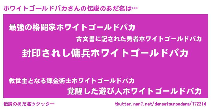 | 胡散臭い通販商品みたいなあだ名 | 『あなたにだけ特別に提供する限定10本のレアな日本酒…その名も「ホワイトゴールドバカ」』 |