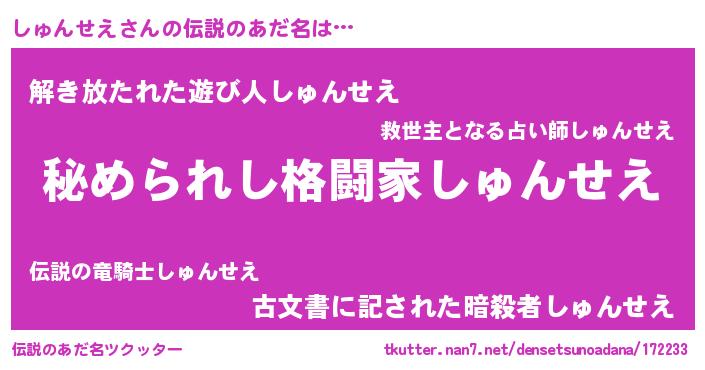 | ヒーロー風カッコイイあだ名 | 『仮面シュダー』『天弓騎士シュ』 |