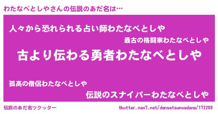 | ヒーロー風カッコイイあだ名 | 『仮面ワタダー』『ネオワタナベトシヤ』 |