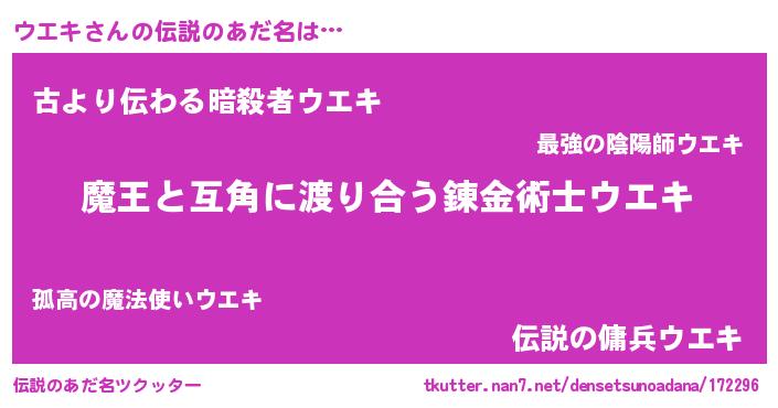 | 男性向けラノベタイトル風あだ名 | 『おまえをオタクにしてやるから、俺をウエキにしてくれ! 』 |