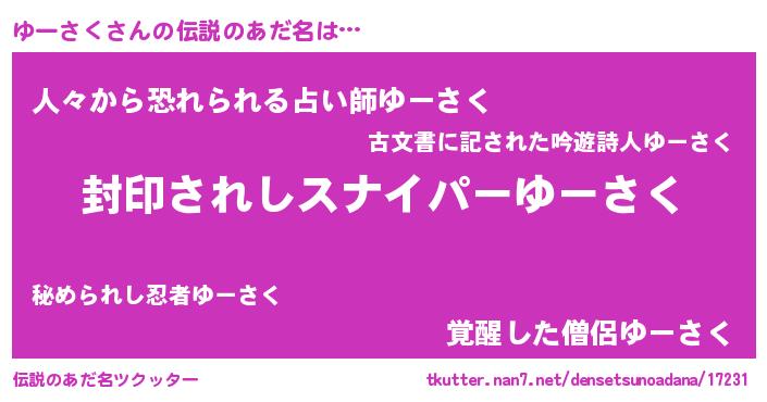 | 胡散臭い通販商品みたいなあだ名 | 『億万長者になれる霊験あらたかなお札…その名も「ゆーさく」』 |