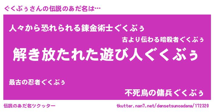 | 男性向けラノベタイトル風あだ名 | 『ダンジョンにぐくぶぅを求めるのは間違っているだろうか』 |