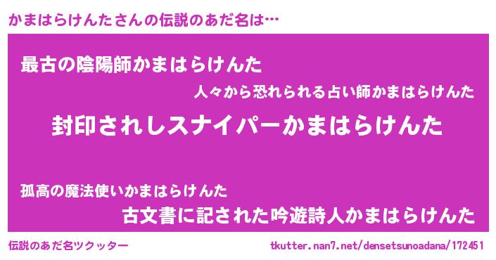 | 胡散臭い通販商品みたいなあだ名 | 『億万長者になれる霊験あらたかなお札…その名も「かまはらけんた」』 |