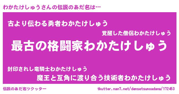 | 男性向けラノベタイトル風あだ名 | 『転生したらわかたけしゅうだった件』 |