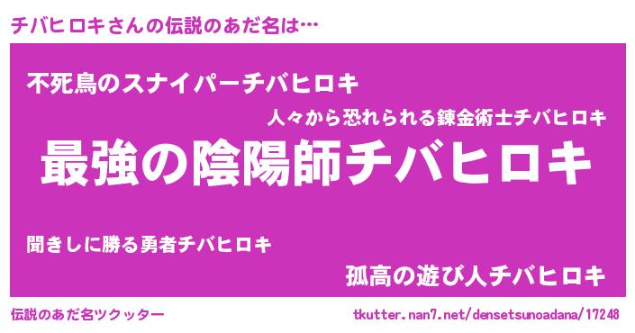 | 男性向けラノベタイトル風あだ名 | 『チバヒロキ~年齢イコール彼女いない歴の魔法使い~』 |