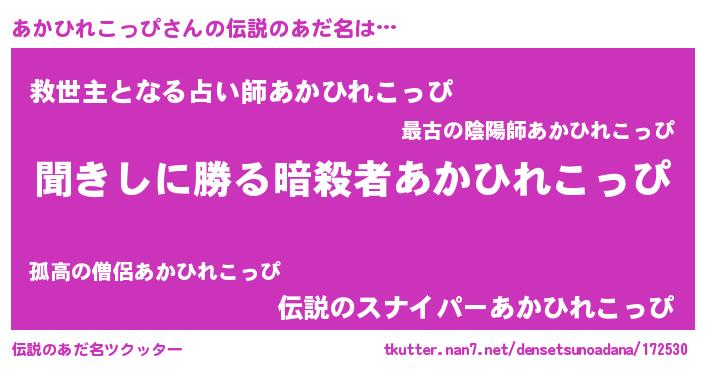 | 男性向けラノベタイトル風あだ名 | 『あかひれこっぴという概念が存在しない退屈な世界 』 |