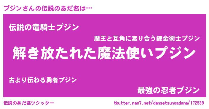 | 意味不明あだ名 | 『住所不定無職プジン(6歳)』『自称プジン』 |