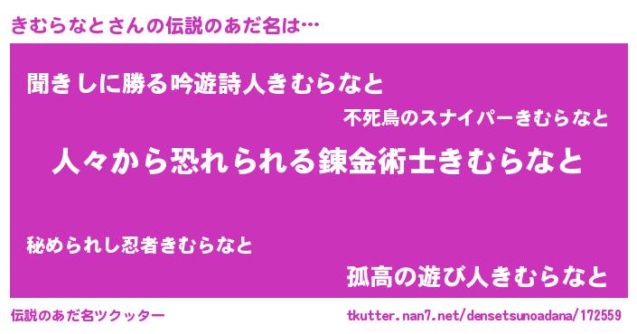 | 男性向けラノベタイトル風あだ名 | 『おまえをオタクにしてやるから、俺をきむらなとにしてくれ! 』 |
