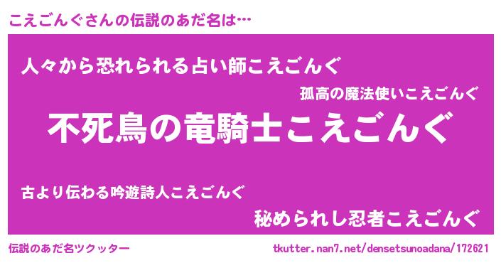 | 女子向けラノベタイトル風あだ名 | 『こえごんぐ姫と円卓の騎士』 |