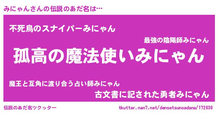 | 男性向けラノベタイトル風あだ名 | 『ダンジョンにみにゃんを求めるのは間違っているだろうか』 |