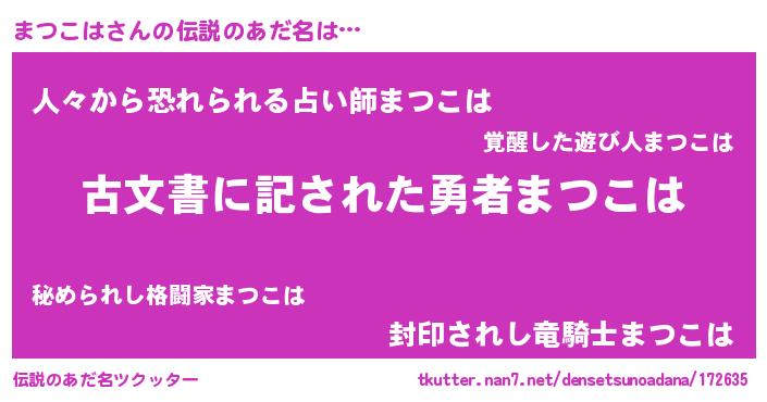 | 男性向けラノベタイトル風あだ名 | 『まつこは~年齢イコール彼女いない歴の魔法使い~』 |