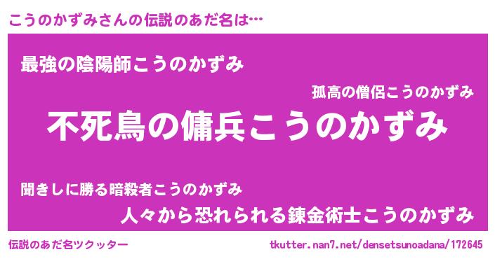 | 女子向けラノベタイトル風あだ名 | 『こうのかずみ姫と円卓の騎士』 |