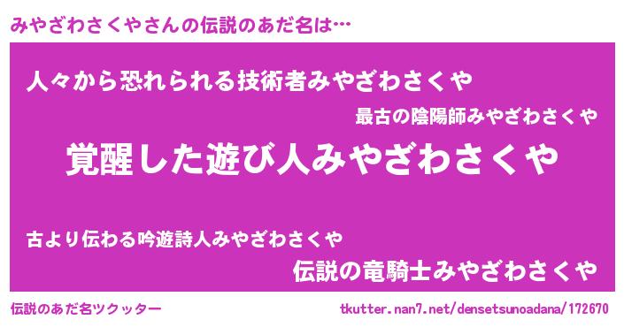 | 男性向けラノベタイトル風あだ名 | 『みやざわさくや~年齢イコール彼女いない歴の魔法使い~』 |