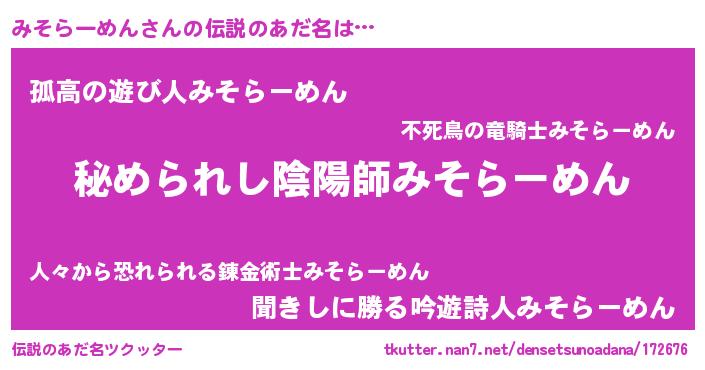 | 男性向けラノベタイトル風あだ名 | 『ミソラーメンスレイヤー』 |