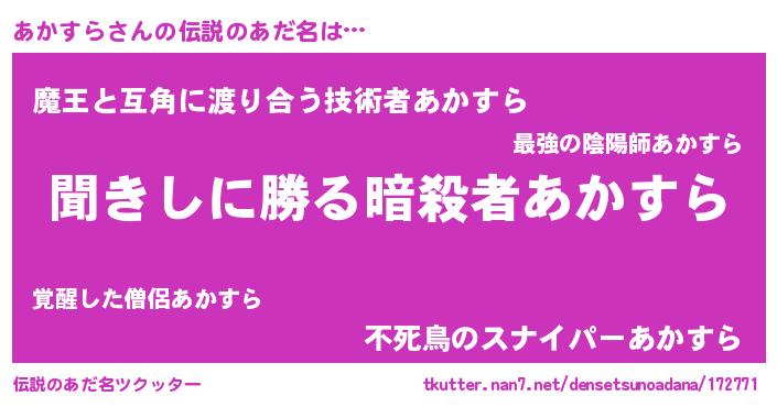 | 意味不明あだ名 | 『永久保存あかすら』『ペロリンあかすら』 |