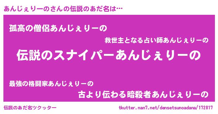 | 女子向けラノベタイトル風あだ名 | 『(仮)あんじぇりーののやんごとなき事情』 |