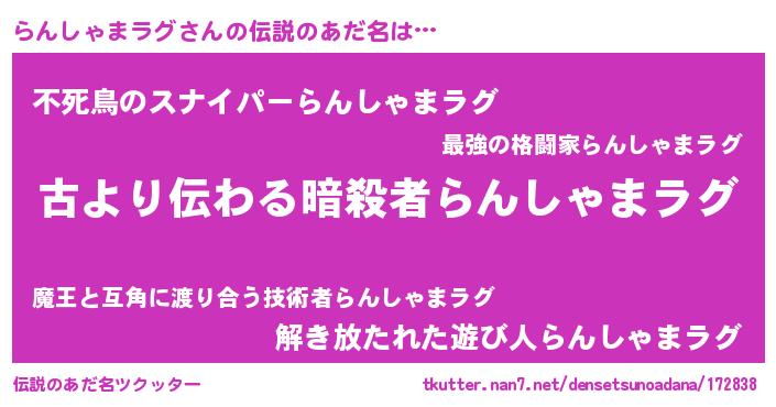 | 胡散臭い通販商品みたいなあだ名 | 『来世でも幸せになれる健康食品…その名も「らんしゃまラグ」』 |
