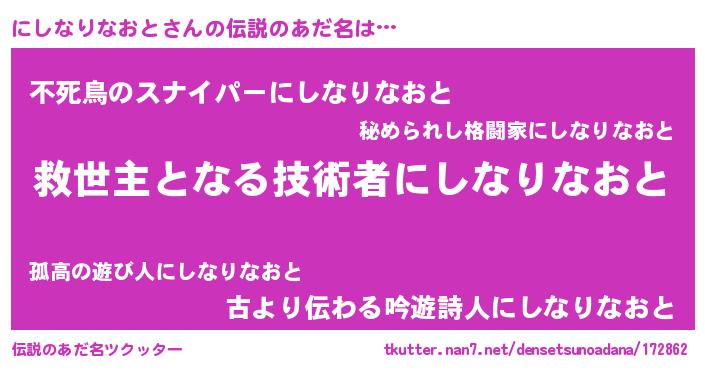 | ヘコむあだ名 | 『にしにー』『にしなりなおと(震え声)』 |