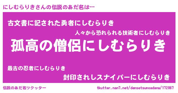 | 男性向けラノベタイトル風あだ名 | 『緋弾のニシムラリキ』 |