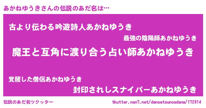| ヘコむあだ名 | 『あかねゆうき(爆)』『あかにー』 |