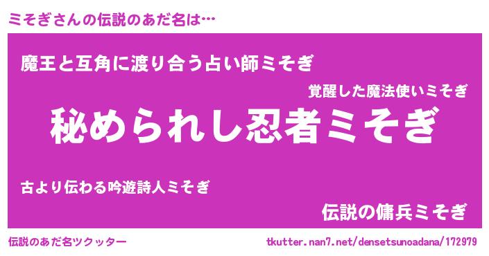 | 女子向けラノベタイトル風あだ名 | 『ミそぎの雑貨屋さん』『闇のミそぎ』 |