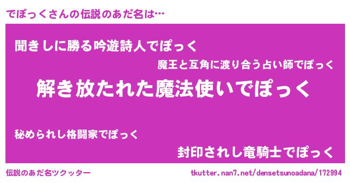 | 男性向けラノベタイトル風あだ名 | 『転生したらでぽっくだった件』 |
