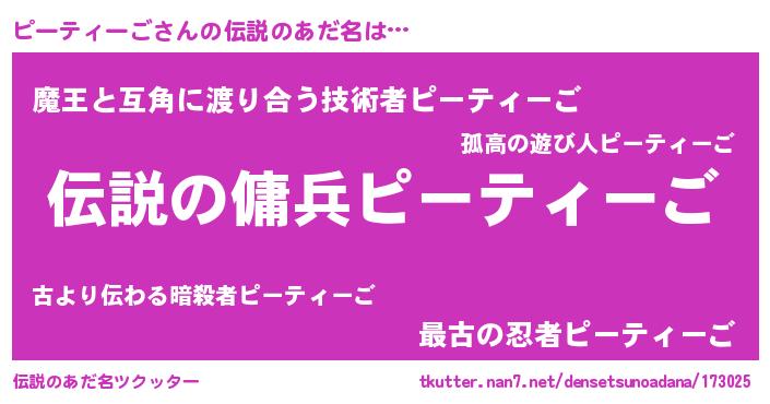 | ヒーロー風カッコイイあだ名 | 『仮面ピーダー』『スーパーピーティーゴ』 |