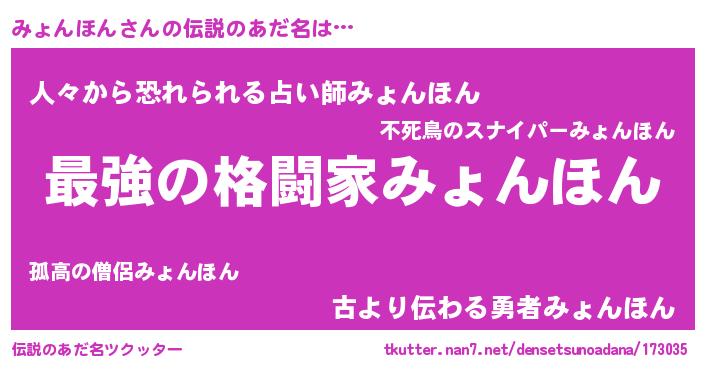 | 男性向けラノベタイトル風あだ名 | 『みょんほん~年齢イコール彼女いない歴の魔法使い~』 |