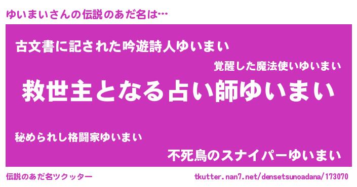 | 男性向けラノベタイトル風あだ名 | 『ゆいまい~年齢イコール彼女いない歴の魔法使い~』 |