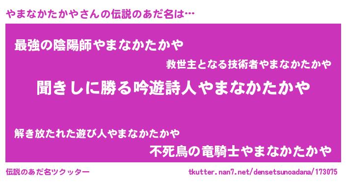 | 男性向けラノベタイトル風あだ名 | 『やまなかたかやという概念が存在しない退屈な世界 』 |