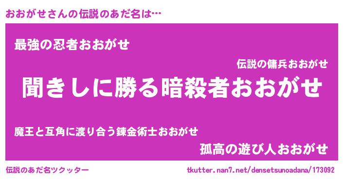 | 男性向けラノベタイトル風あだ名 | 『おおがせという概念が存在しない退屈な世界 』 |