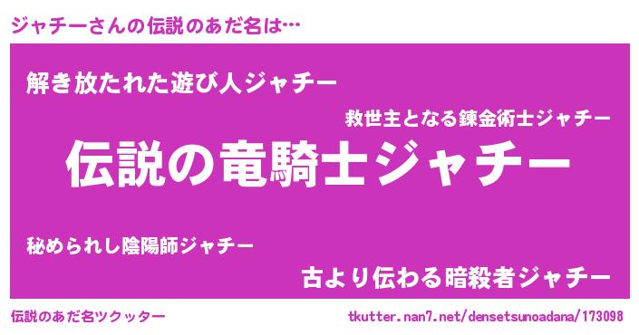 | 男性向けラノベタイトル風あだ名 | 『ジャチースレイヤー』 |