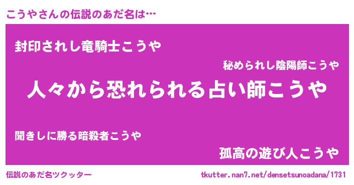 | 男性向けラノベタイトル風あだ名 | 『おまえをオタクにしてやるから、俺をこうやにしてくれ! 』 |