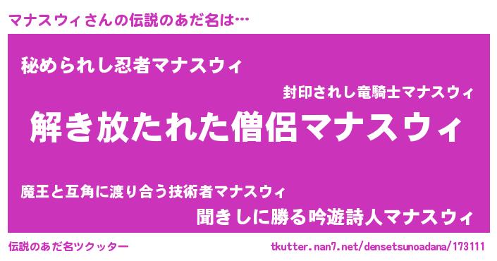 | 意味不明あだ名 | 『とにかく怪しいマナスウィ』 |