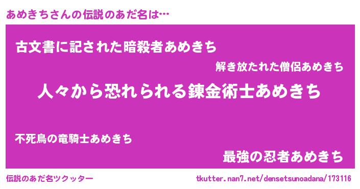 | 男性向けラノベタイトル風あだ名 | 『アメキチスレイヤー』 |