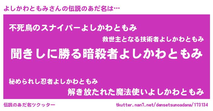 | 意味不明あだ名 | 『永久保存よしかわともみ』 |